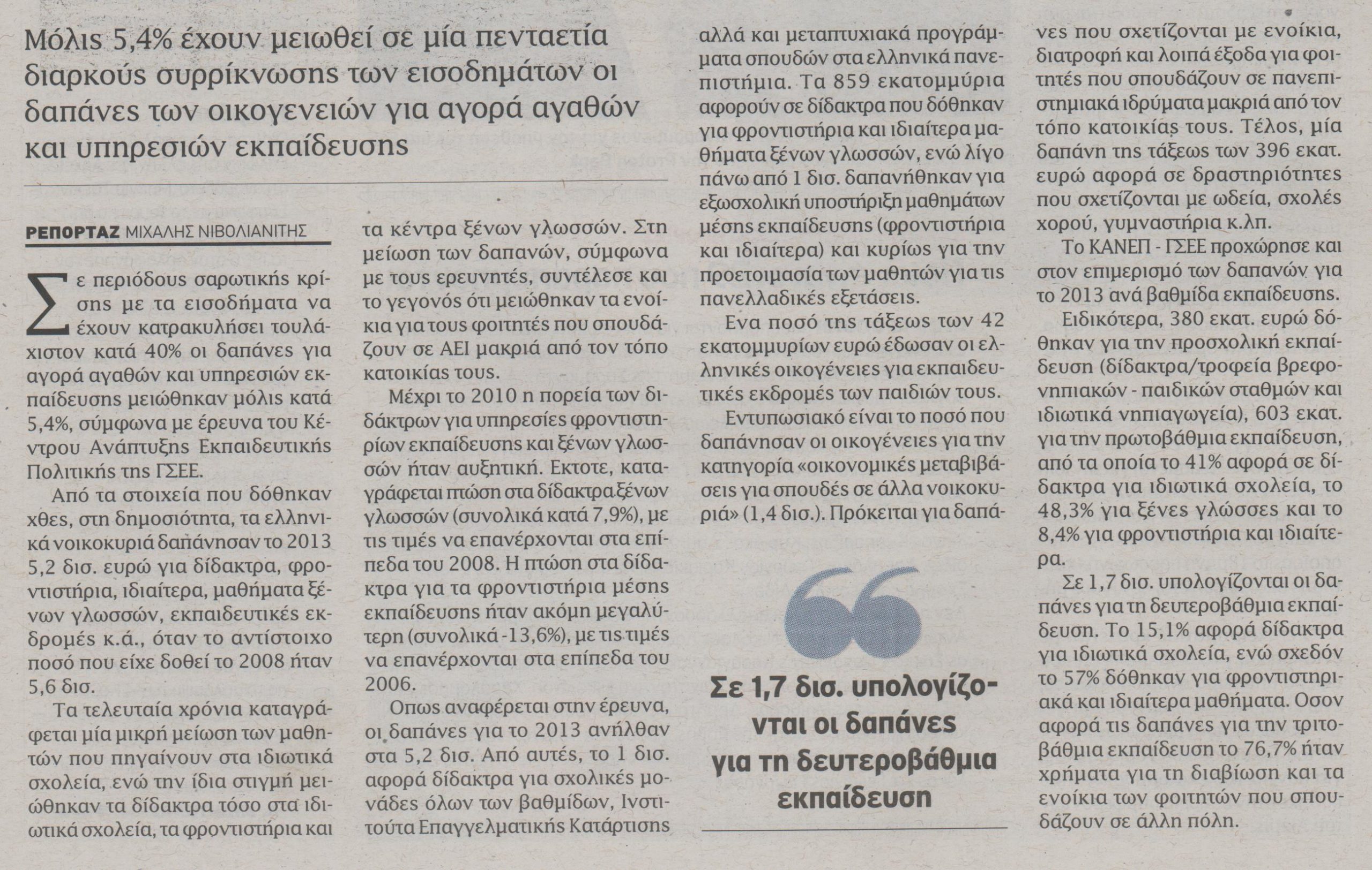 Σε περιόδους σαρωτικής κρίσης με τα εισοδήματα να έχουν κατρακυλήσει τουλάχιστον κατά 40% οι δαπάνες για αγορά αγαθών και υπηρεσιών εκπαίδευσης μειώθηκαν μόλις κατά 5,4%, σύμφωνα με έρευνα του Κέντρου Ανάπτυξης Εκπαιδευτικής Πολιτικής της ΓΣΕΕ.