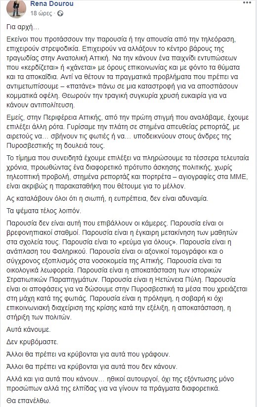 Όπως σημειώνει η Περιφερειάρχης μεταξύ άλλων “εκείνοι που προτάσσουν την παρουσία ή την απουσία από την τηλεόραση, επιχειρούν στρεψοδικία. Επιχειρούν να αλλάξουν το κέντρο βάρους της τραγωδίας στην Ανατολική Αττική. Να την κάνουν ένα παιχνίδι εντυπώσεων που «κερδίζεται» ή «χάνεται» με όρους επικοινωνίας και με φόντο τα θύματα και τα αποκαΐδια. Αντί να θέτουν τα πραγματικά προβλήματα που πρέπει να αντιμετωπίσουμε – «πατάνε» πάνω σε μια καταστροφή για να αποσπάσουν κομματικά οφέλη. Θεωρούν την τραγική συγκυρία χρυσή ευκαιρία για να κάνουν αντιπολίτευση”.
