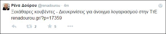 «Ξεκάθαρες κουβέντες – Διευκρινίσεις για άνοιγμα λογαριασμού στην ΤτΕ», αναφέρει το «τιτίβισμα» της περιφερειάρχη Αττικής.