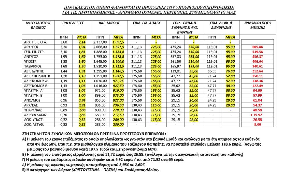Αναλυτικό πίνακα με τους μισθούς των αξιωματούχων των Σωμάτων Ασφαλείας μετά την ψήφιση των μέτρων δημοσιεύουν σε ανακοίνωσή τους οι Ομοσπονδίες των Σωμάτων Ασφαλείας.