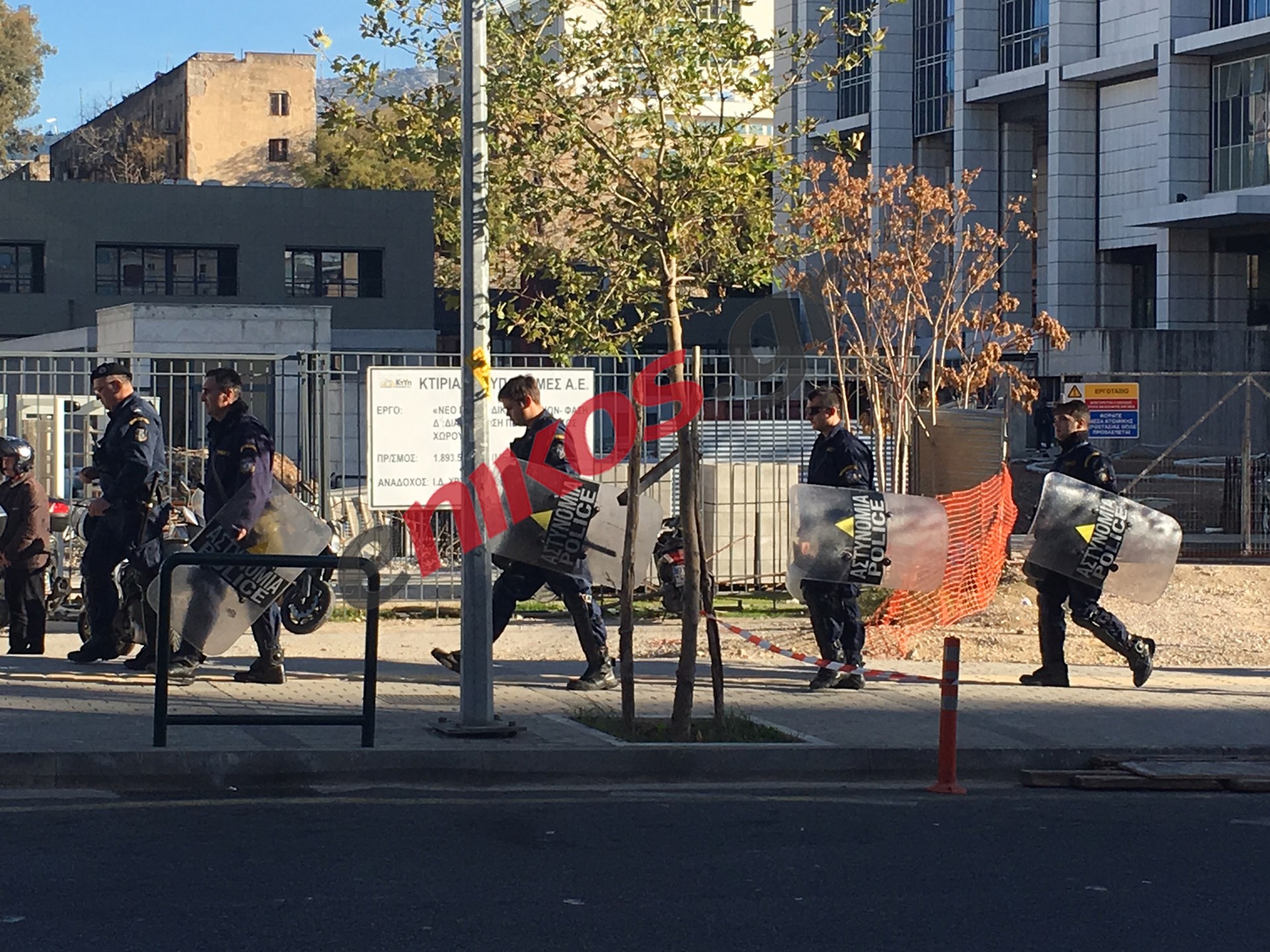 Από την πλευρά της οδού Λουκάρεως έχει στηθεί μια κλούβα της αστυνομίας προκειμένου να φράξει την πρόσβαση των διαδηλωτών στο κτίριο του Ειρηνοδικείου, ενώ γύρω από αυτό υπάρχουν παντού διμοιρίες των ΜΑΤ και της ΥΜΕΤ.