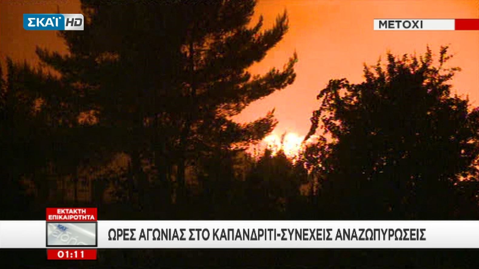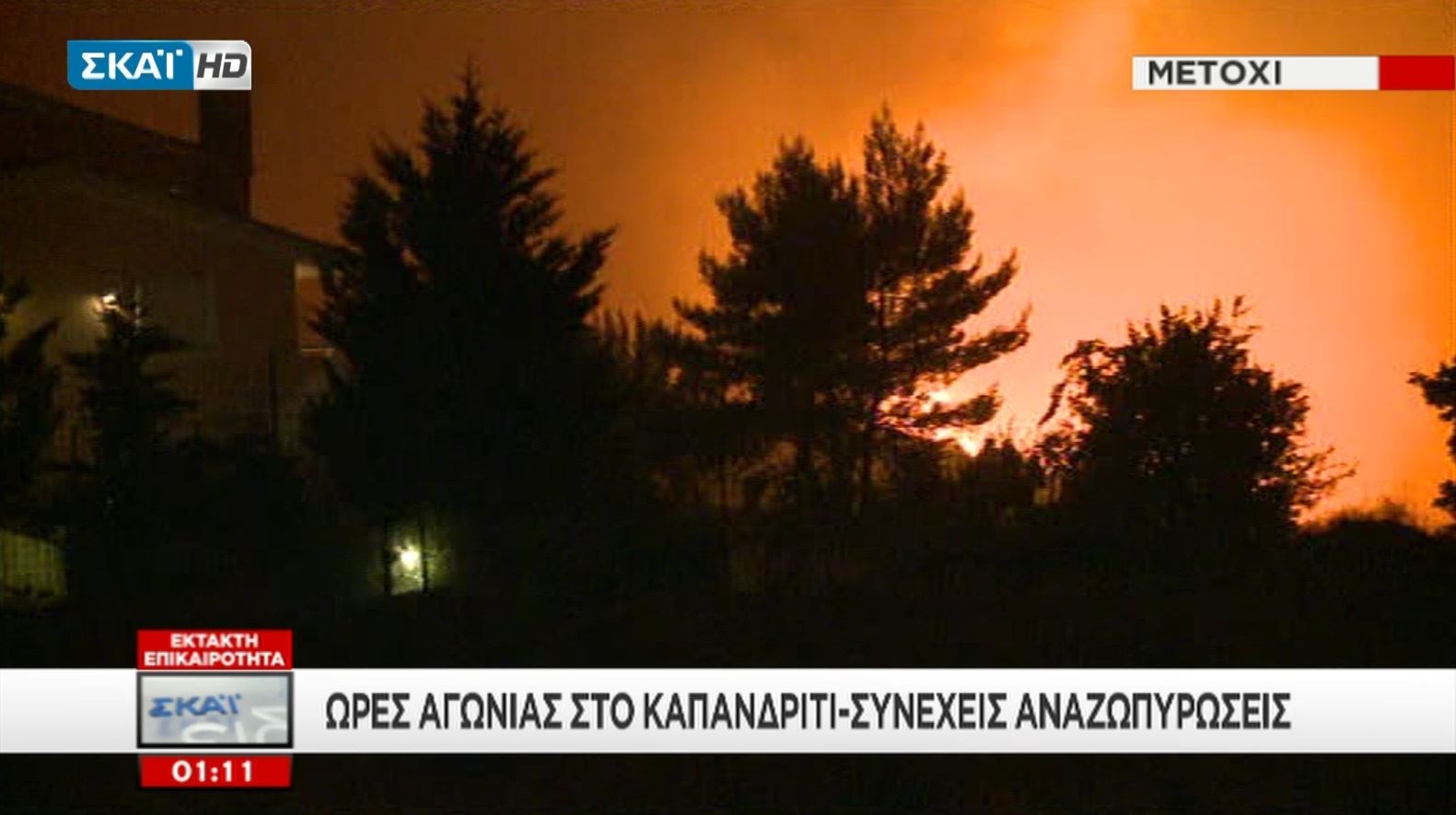 Δραματική παραμένει η κατάσταση στα πύρινα μέτωπα της Αττικής. Παρά το γεγονός ότι ο άνεμος έχει κοπάσει ελαφρώς, οι αναζωπυρώσεις είναι συνεχείς. Στις περιοχές Τριάδες και Μετόχι του Καπανδριτίου αυτή την ώρα οι φλόγες έχουν πλησιάσει απελπιστικά κοντά τα σπίτια όπως βλέπετε στις εικόνες που μετέδωσε πριν από λίγα λεπτά ο ΣΚΑΪ.