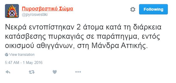 «Νεκρά εντοπίστηκαν 2 άτομα κατά τη διάρκεια κατάσβεσης πυρκαγιάς σε παράπηγμα, εντός οικισμού αθιγγάνων, στη Μάνδρα Αττικής».