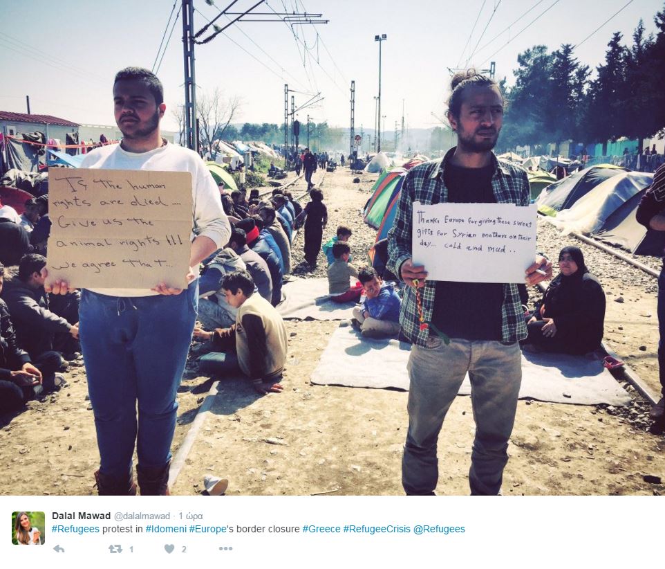 Δύο παράλληλες εκδηλώσεις διαμαρτυρίας είναι σε εξέλιξη αυτή την ώρα στον καταυλισμό της Ειδομένης. Η μία πραγματοποιείται πάνω στις σιδηροδρομικές γραμμές από μικρή ομάδα Σύρων που κρατούν πλακάτ με συνθήματα όπως «ανοίξτε τα σύνορα» και «πεθαίνουμε εδώ», και ζητούν να τους επιτραπεί η διέλευση στα Σκόπια.