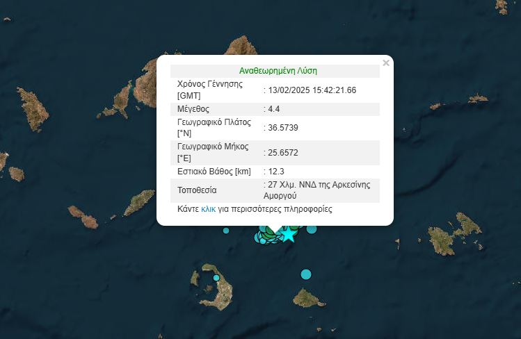 Δύο σεισμοί 4,4 Ρίχτερ, με διαφορά 2 λεπτών, σημειώθηκαν το απόγευμα της Πέμπτης, ανοιχτά της Αμοργού.