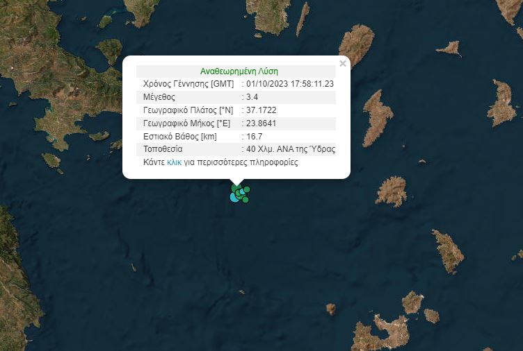 Δύο σεισμοί με διαφορά δύο λεπτών σημειώθηκαν το βράδυ της Κυριακής (1/10) στον θαλάσσιο χώρο μεταξύ Ύδρας και Σερίφου.
