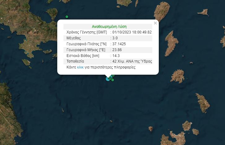 Δύο σεισμοί με διαφορά δύο λεπτών σημειώθηκαν το βράδυ της Κυριακής (1/10) στον θαλάσσιο χώρο μεταξύ Ύδρας και Σερίφου.