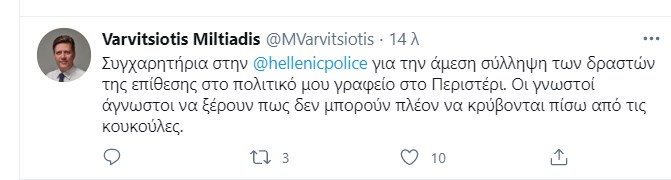 “Δεν μπορούν πλέον να κρύβονται πίσω από τις κουκούλες””Θα ήθελα να συγχαρώ τους αστυνομικούς της Υποδιεύθυνσης Κρατικής Ασφάλειας της Διεύθυνσης Ασφάλειας Αττικής, που με τη συνδρομή και της Αντιτρομοκρατικής Υπηρεσίας προχώρησαν στην άμεση σύλληψη δύο εκ των δραστών της επίθεσης στο πολιτικό μου γραφείο στο Περιστέρι. Οι γνωστοί άγνωστοι να ξέρουν πως δεν μπορούν πλέον να κρύβονται πίσω από τις κουκούλες” δήλωσε ο αναπληρωτής υπουργός Εξωτερικών Μιλτιάδης Βαρβιτσιώτης μετά τις δύο συλλήψεις.