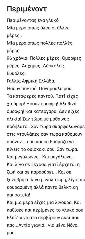 «Περιμένοντας ένα γλυκό. Μια μέρα όπως όλες οι άλλες ημέρες… Μια μέρα όπως πολλές πολλές μέρες… 96 χρόνια. Πολλές μέρες. Όμορφες μέρες. Άσχημες. Δύσκολες. Εύκολες. Γαλλία, Αφρική, Ελλάδα. Ήσουν παντού. Πονηρούλα μου. Τα κατάφερες παντού γιατί είχες χιούμορ. Ήσουν όμορφη. Αληθινά όμορφη. Και κατεργάρα. Δεν είχες ηλικία. Σαν τώρα με μάθαινες ποδήλατο. Σαν τώρα σκαρφαλώναμε στις ντουλάπες, σαν τώρα καθόμουν απέναντί σου και σε θαύμαζα να πίνεις το ουισκάκι σου. Σαν τώρα. Και μεγάλωνες. Και μεγάλωνα. Και λίγο σε ξέχασα και έρχεται η ζωή και σε παρασύρει… Και σε ξαναβρήκα λίγο μεγαλύτερη λίγο πιο κουρασμένη αλλά πάντα θελκτική και αστεία. Και μια μέρα είχες μια λιγούρα. Και κάθισες και περίμενες το γλυκό σου. Ελπίζω να στο σερβίρουν εκεί που πας.. Αντίο γιαγιά… για μένα Νονά μου».