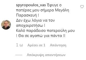 Βαρύ πένθος έχει η οικογένεια της Κωνσταντίνας Σπυροπούλου καθώς έφυγε από τη ζωή ο πολυαγαπημένος της παππούς. Η ίδια το ανακοίνωσε αναρτώντας μία φωτογραφία στον λογαριασμό της στο instagram. O πατέρας της έγραψε σχόλιο τονίζοντας ότι έφυγε από τη ζωή ο πατέρας του ενώ η παρουσιάστρια στη συνέχεια ανήρτησε και σχετικό insta story.