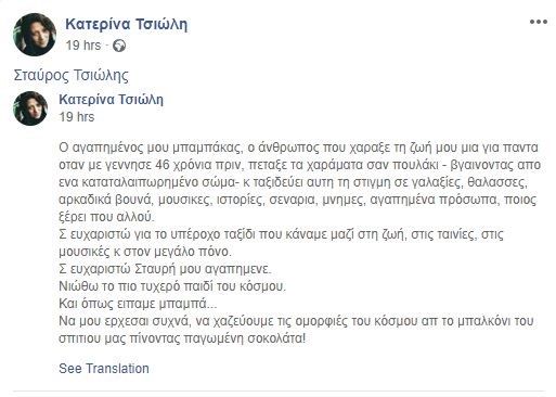 Στην πρώτη ανάρτηση η Κατερίνα Τσιώλη γράφει “Σε ευχαριστώ Σταύρο μου αγαπημένε… Σε ευχαριστώ για το υπέροχο ταξίδι που κάναμε μαζί στη ζωή, στις ταινίες και τις μουσικές…”. Στη δεύτερη αναφέρει ότι “είναι δύσκολη νύχτα απόψε. Στο σπίτι εδώ με τα γραφτά του και τα αποτυπώματά του παντού. Εγώ εδώ κι αυτό στο ψυγείο μαζί με άλλους 6 συνταξιδιώτες”.