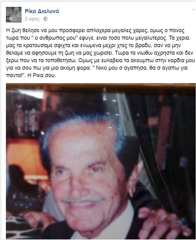 Δύσκολες ώρες περνά η ηθοποιός Ρίκα Διαλυνά, καθώς έφυγε από τη ζωή ο σύζυγός της.Η ηθοποιός δημοσίευσε ένα συγκινητικό μήνυμα στον προσωπικό της λογαριασμό στο facebook.«Η ζωή θέλησε να μου προσφέρει απλόχερα μεγάλες χάρες, όμως ο πόνος τώρα που “ο άνθρωπος μου” έφυγε, είναι τόσο πολύ μεγαλύτερος. Τα χέρια μας τα κρατούσαμε σφιχτά και ενωμένα μέχρι χθες το βράδυ, σαν να μην θέλαμε να αφήσουμε τη ζωή να μας χωρίσει. Τώρα τα νιώθω άχρηστα και δεν ξέρω που να τα τοποθετήσω. Όμως με ευλάβεια τα ακουμπώ στην καρδιά μου για να σου πω για μια ακόμη φορά: “Νίκο μου σ΄αγάπησα, θα σ’αγαπώ για πάντα!”. Η Ρίκα σου» έγραψε χαρακτηριστικά η ηθοποιός, αναρτώντας μία φωτογραφία του συζύγου της.Δείτε την ανάρτηση:
