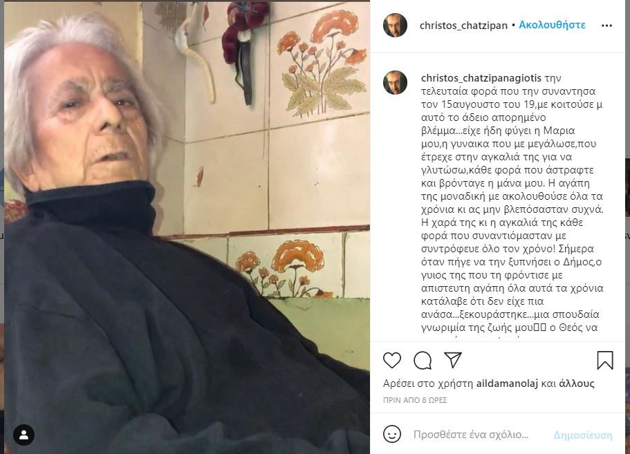 Σήμερα όταν πήγε να την ξυπνήσει ο Δήμος, ο γιος της που τη φρόντισε με απίστευτη αγάπη όλα αυτά τα χρόνια κατάλαβε ότι δεν είχε πια ανάσα…ξεκουράστηκε…μια σπουδαία γνωριμία της ζωής μου, ο Θεός να αναπαύσει την ψυχή της” ε΄γραψε στην ανάρτησή του ο Χρήστος Χατζηπαναγιώτης.