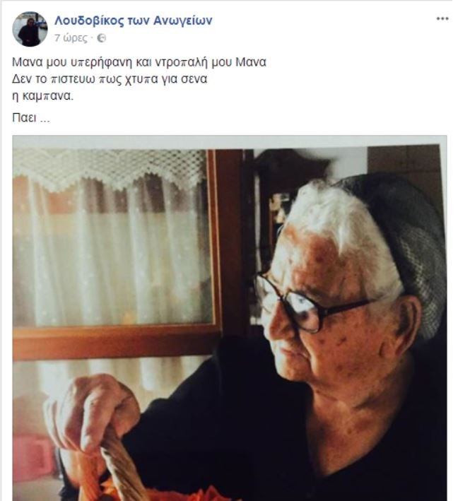 “Μάνα μου υπερήφανη και ντροπαλή μου Μάνα. Δεν το πιστεύω πως χτυπά για σένα η καμπάνα. Πάει …” έγραψε συντετριμμένος ο Λουδοβίκος των Ανωγείων στον προσωπικό του λογαριασμό στο Facebook.