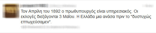 Μια έξυπνη επισήμανση που αφορά σε μια “ιστορική σύμπτωση” εν όψει εκλογών:Ο χρήστης του twitter επισημαίνει ότι λίγο πριν τις εκλογές του 1892 -που τότε διεξήχθησαν στις 3 Μαΐου- ο πρωθυπουργός, Θ.Δηλιγιάννης, ήταν επίσης υπηρεσιακός, ενώ η Ελλάδα βρισκόταν μια ανάσα πριν το “δυστυχώς επτωχεύσαμεν.