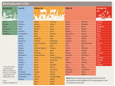 Το 43% των χωρών που ερευνήθηκαν κατατάσσονται στις ομάδες υψηλού ή πολύ υψηλού κινδύνου κοινωνικής αναταραχής το 2014.