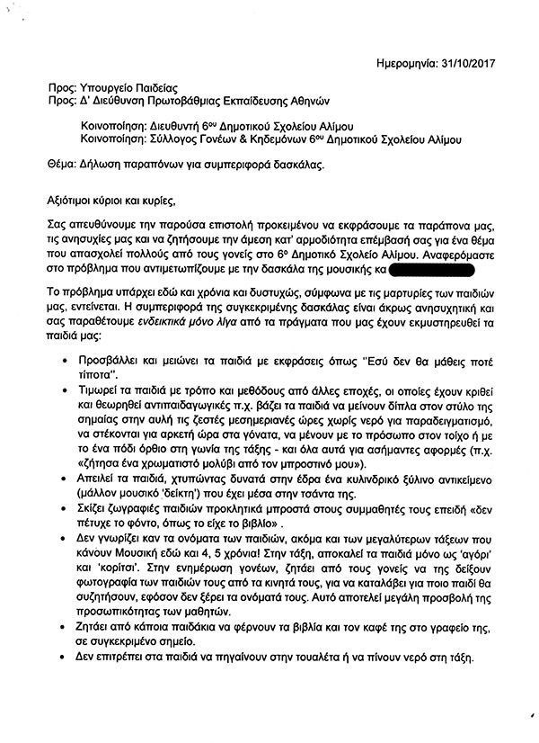Σύμφωνα με κείμενο που συνέταξαν αρκετοί γονείς σε βάρος της εκπαιδευτικού, η δασκάλα μουσικής έβαζε επίσης τα παιδιά να στέκονται για ώρα στα γόνατα, να μένουν με το πρόσωπο στον τοίχο ή με το ένα πόδι όρθιο στη γωνία της τάξης, τα απειλούσε χτυπώντας δυνατά στην έδρα ένα κυλινδρικό ξύλινο αντικείμενο, έσκιζε ζωγραφιές τους μπροστά σε όλους όταν τις έκρινε «αποτυχημένες».