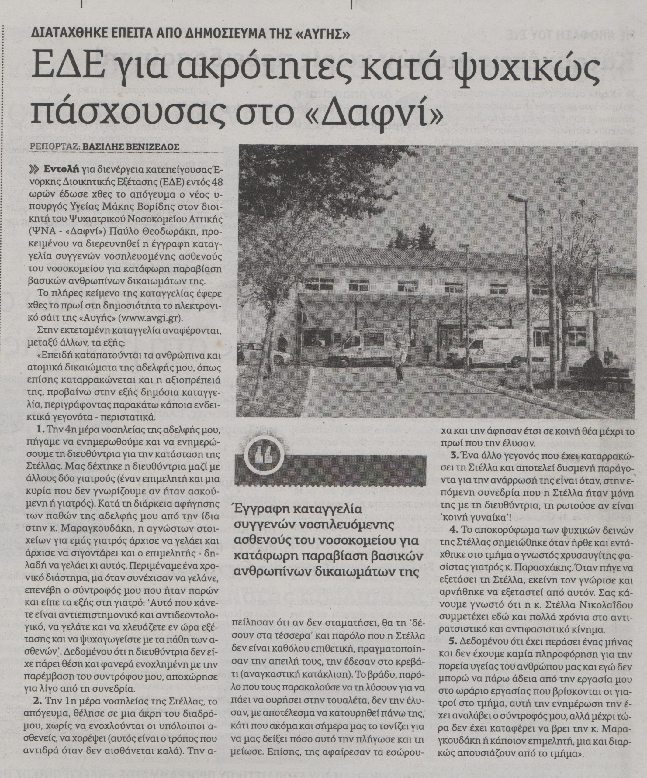 Εντολή για διενέργεια κατεπείγουσας Ένορκης Διοικητικής Εξέτασης (ΕΔΕ) εντός 48 ωρών έδωσε χθες το απόγευμα ο νέος υπουργός Υγείας, Μάκης Βορίδης, στον διοικητή του Ψυχιατρικού Νοσοκομείου Αθηνών (ΨΝΑ-«Δαφνί»), Παύλο Θεοδωράκη, προκειμένου να διερευνηθεί η έγγραφη καταγγελία συγγενών νοσηλευόμενης ασθενούς του νοσοκομείου για κατάφωρη παραβίαση ανθρωπίνων δικαιωμάτων της.