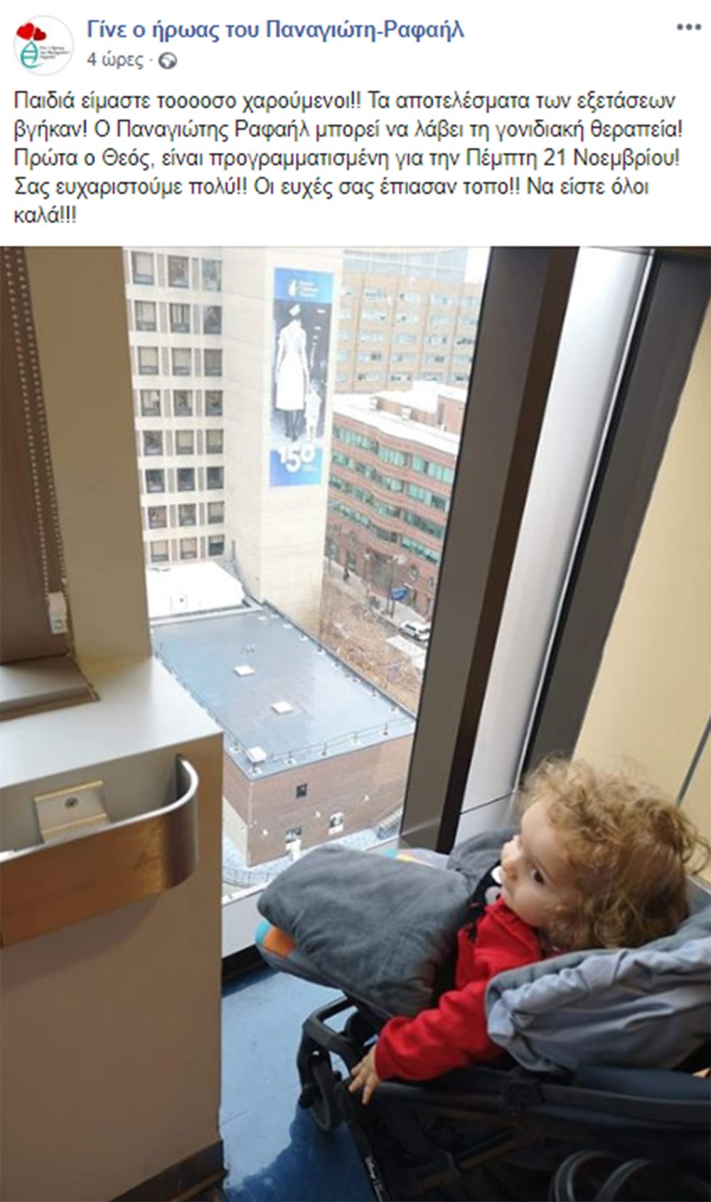 “Παιδιά είμαστε τόσο χαρούμενοι!! Τα αποτελέσματα των εξετάσεων βγήκαν! Ο Παναγιώτης Ραφαήλ μπορεί να λάβει τη γονιδιακή θεραπεία! Πρώτα ο Θεός, είναι προγραμματισμένη για την Πέμπτη 21 Νοεμβρίου! Σας ευχαριστούμε πολύ!! Οι ευχές σας έπιασαν τόπο!! Να είστε όλοι καλά!!!”, έγραψε ο πατέρας του Παναγιώτη–Ραφαήλ.
