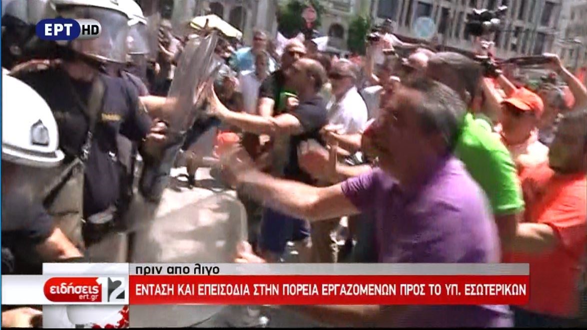 Το πρωί επικράτησε ένταση έξω από το Υπουργείο Εσωτερικών στην Πλατεία Κλαυθμώνος, όπου κατέληξε η πορεία της ΠΟΕ-ΟΤΑ. Η ολιγόλεπτη ένταση προκλήθηκε όταν ομάδα διαδηλωτών επιχείρησε να εισβάλει στο υπουργείο και απωθήθηκε από άνδρες των ΜΑΤ.