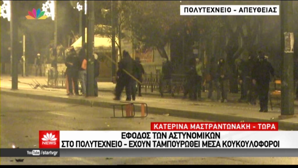 Οι κουκουλοφόροι έχουν εφοδιαστεί με ξύλα και άλλα αντικείμενα προκειμένου να είναι ετοιμοπόλεμοι σε περίπτωση που κινηθούν εναντίον τους οι άνδρες των ΜΑΤ.
