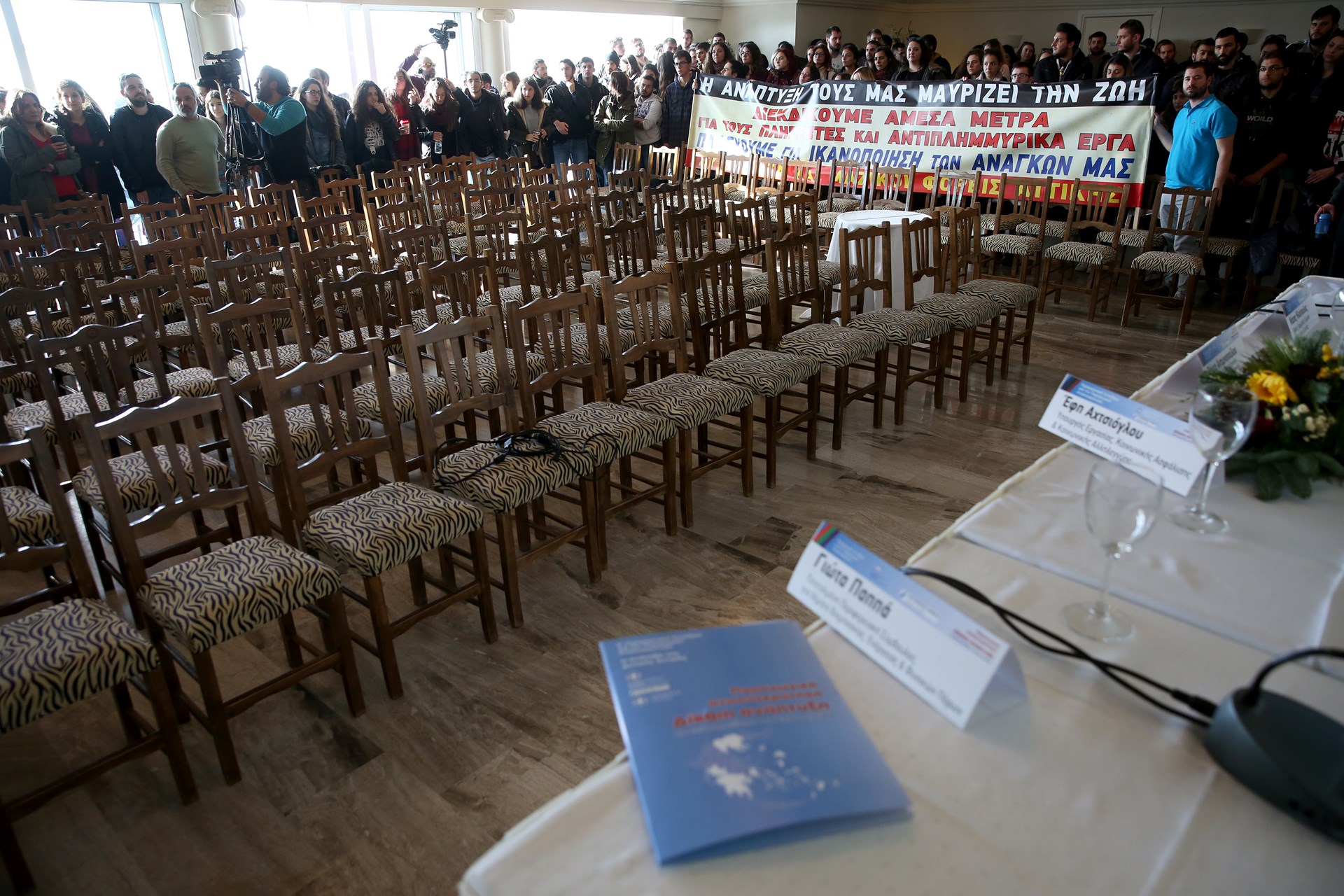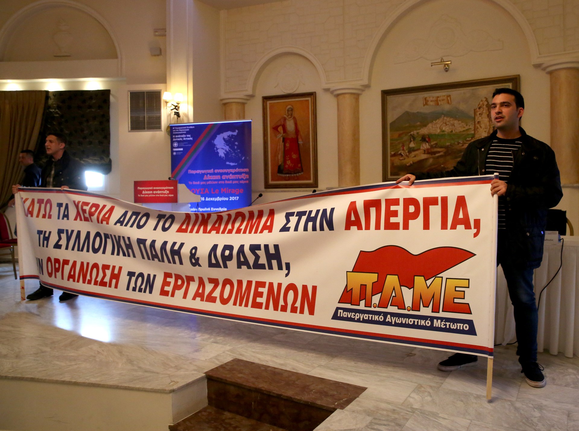 Μέλη του ΠΑΜΕ, σωματεία και φορείς άνοιξαν πανό και έκαναν κατάληψη στην αίθουσα όπου θα μιλούσε η υπουργός Εργασίας Κοινωνικής Ασφάλισης και Κοινωνικής Αλληλεγγύης, Έφη Αχτσιόγλου, στο «8ο Περιφερειακό Συνέδριο για την Παραγωγική Ανασυγκρότηση: Η Ανάταξη της Δυτικής Αττικής», που ολοκληρώνεται σήμερα στα Μέγαρα.