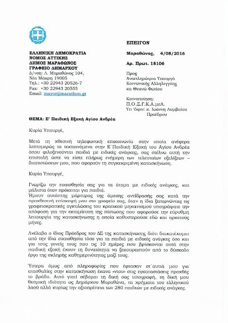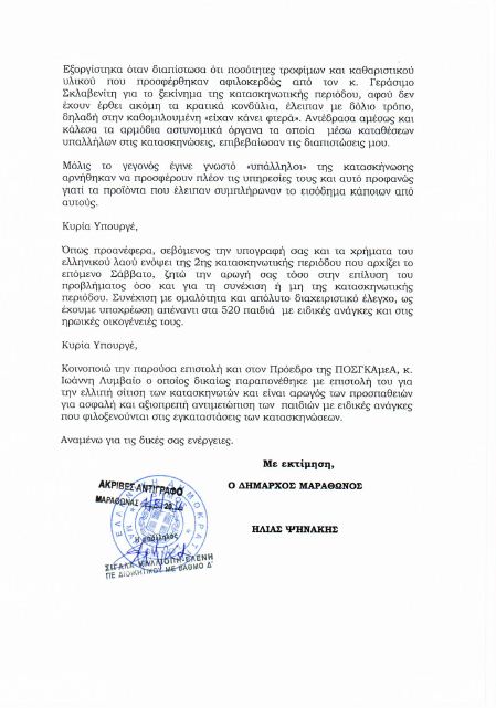 Ο κ. Ψινάκης ζητά την αρωγή της κ. Φωτίου τόσο στην επίλυση του όσο και για τη συνέχιση ή μη της κατασκηνωτικής περιόδου.