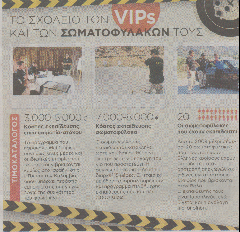 «Μητρόπολη» αυτού του είδους των εκπαιδεύσεων θεωρείται το Ισραήλ, ενώ ανάλογες εταιρείες υπάρχουν στην Κολομβία –όπου υπάρχει μεγάλη εμπειρία στις απαγωγές-, στις ΗΠΑ και στην Ελλάδα. Ο εκπρόσωπος της εταιρείας Α & Κ Bodyguard Academy, Άγγελος Αγραφιώτης, επιβεβαιώνει ότι μέλη ισχυρών οικονομικά οικογενειών, που δεν είχαν μέχρι τώρα φύλαξη και εκπαίδευση στις απαγωγές, προσέρχονται στους ειδικούς θορυβημένοι.