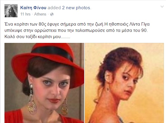 “Ένα κορίτσι των 80ς έφυγε σήμερα από την ζωή. Η ηθοποιός Λίντα Γίγα υπέκυψε στην αρρώστια που την ταλαιπωρούσε από τα μέσα του 90. Καλό σου ταξίδι κορίτσι μου………”