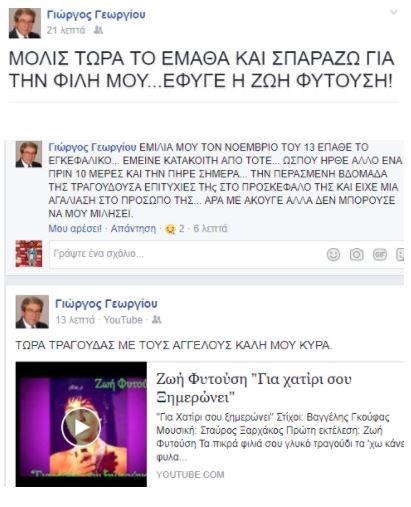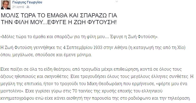 Την είδηση έκανε γνωστή ο ηθοποιός και φίλος της Γιώργος Γεωργίου με ανάρτηση στο Facebook.