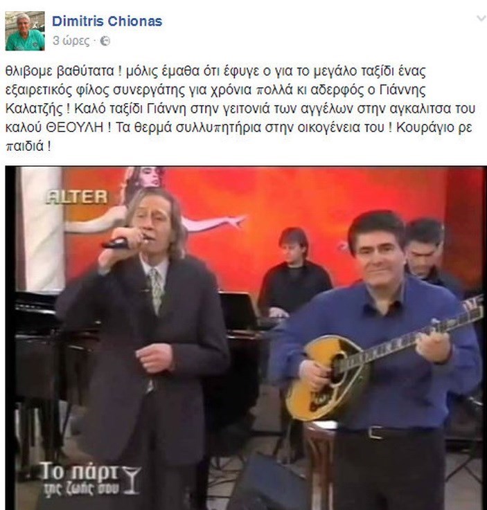 «Θλίβομαι βαθύτατα. Μόλις έμαθα ότι έφυγε για το μεγάλο ταξίδι ένας εξαιρετικός φίλος συνεργάτης για χρόνια πολλά κι αδερφός ο Γιάννης Καλατζής! Καλό ταξίδι Γιάννη στην γειτονιά των αγγέλων στην αγκαλίτσα του καλού Θεούλη! Τα θερμά συλλυπητήρια στην οικογένεια του ! Κουράγιο ρε παιδιά!».
