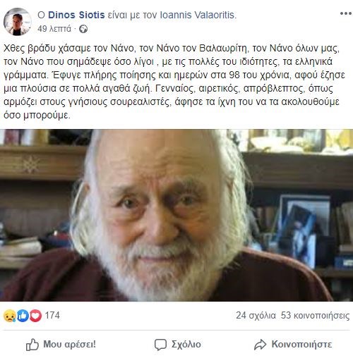 Την είδηση του θανάτου γνωστοποίησε με ανάρτησή του στο facebook o ποιητής και εκδότης Ντίνος Σιώτης. «Χθες βράδυ χάσαμε τον Νάνο, τον Νάνο τον Βαλαωρίτη, τον Νάνο όλων μας, τον Νάνο που σημάδεψε όσο λίγοι , με τις πολλές του ιδιότητες, τα ελληνικά γράμματα. Έφυγε πλήρης ποίησης και ημερών στα 98 του χρόνια, αφού έζησε μια πλούσια σε πολλά αγαθά ζωή. Γενναίος, αιρετικός, απρόβλεπτος, όπως αρμόζει στους γνήσιους σουρεαλιστές, άφησε τα ίχνη του να τα ακολουθούμε όσο μπορούμε», ανέφερε χαρακτηριστικά.
