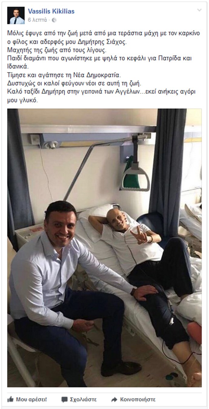 Την είδηση του θανάτου έκανε γνωστή με ανάρτησή του στο Facebook o εκπρόσωπος Τύπου της Νέας Δημοκρατίας, Βασίλης Κικίλιας. «Μόλις έφυγε από τη ζωή μετά από μια τεράστια μάχη με τον καρκίνο ο φίλος μου Δημήτρης Σιάχος. Μαχητής της ζωής από τους λίγους. Παιδί διαμάντι που αγωνίστηκε με ψηλά το κεφάλι για Πατρίδα και Ιδανικά. Τίμησε και αγάπησε τη Νέα Δημοκρατία. Δυστυχώς οι καλοί φεύγουν νέοι σε αυτήν τη ζωή. Καλό ταξίδι Δημήτρη στη γειτονιά των Αγγέλων… εκεί ανήκεις αγόρι μου γλυκό», έγραψε.
