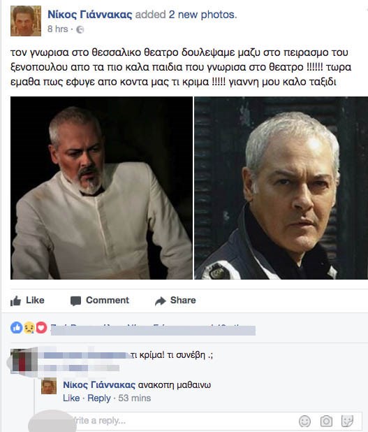 «Τον γνώρισα στο θεσσαλικό θέατρο δουλέψαμε μαζί στο Πειρασμό του Ξενόπουλου από τα πιο καλά παιδιά που γνώρισα στο θέατρο. Τώρα έμαθα πως έφυγε από κοντά μας τι κρίμα! Γιάννη μου καλό ταξίδι», έγραψε ο Νίκος Γιάννακας.