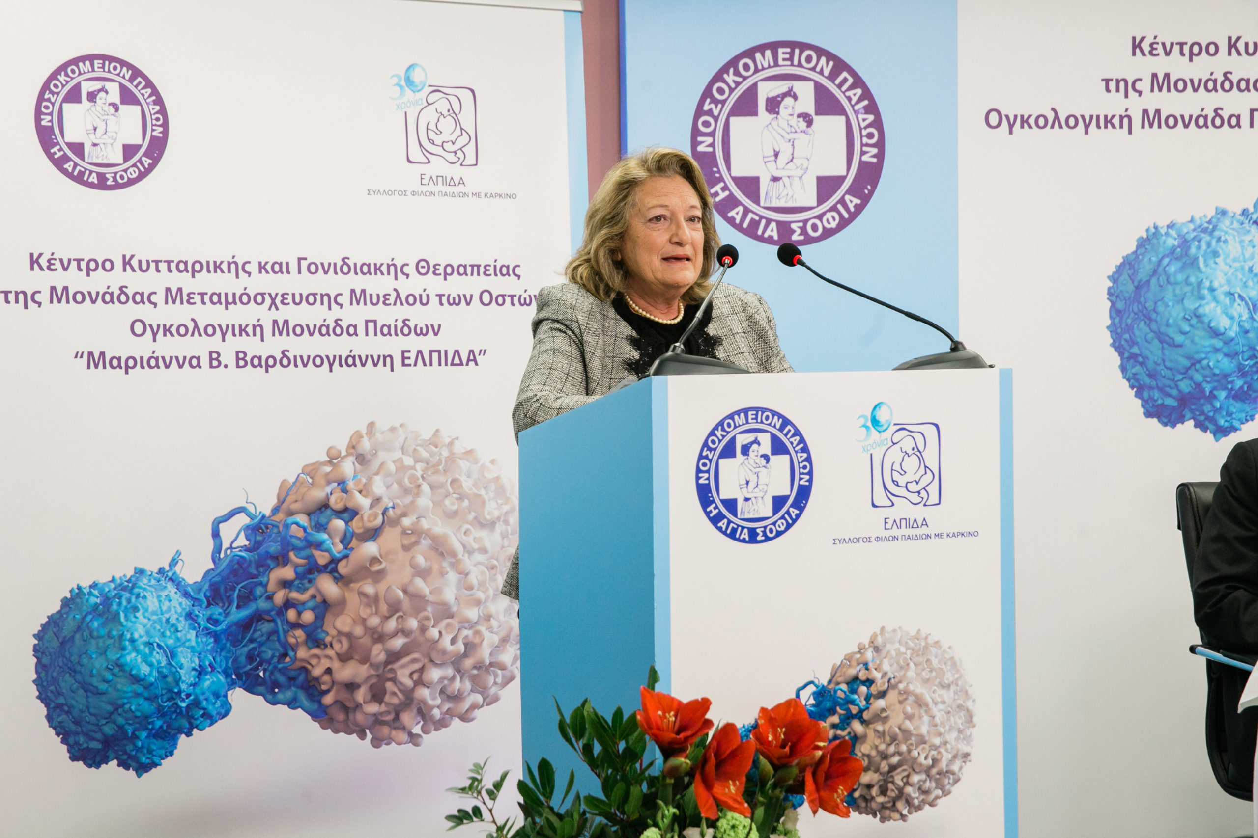 «Όταν πριν από 30 χρόνια ξεκινήσαμε με την «ΕΛΠΙΔΑ» τον αγώνα κατά του παιδικού καρκίνου, ο στόχος ήταν ένας: να μην αφήσουμε ούτε ένα παιδί να χαθεί. Με τη βοήθεια της επιστήμης, του Θεού και ολόκληρης της ελληνικής κοινωνίας αυτή τη στιγμή 3 στα 4 παιδιά που δίνουν την μάχη με τον καρκίνο και νοσηλεύονται στην Ογκολογική μας Μονάδα, θεραπεύονται. Το Κέντρο Κυτταρικής και Γονιδιακής Θεραπείας που η «ΕΛΠΙΔΑ» προσφέρει στην Ογκολογική Μονάδα Παίδων αποτελεί ένα άλμα στο μέλλον. Μέσα από αυτό το έργο μπορούμε πια να ελπίζουμε ότι 4 στα 4 παιδιά μας, ακόμα και εκείνα που δεν ανταποκρίθηκαν στις συμβατικές θεραπείες, θα γίνονται εντελώς καλά. Αυτό που πριν από 30 χρόνια έμοιαζε για την ανθρωπότητα και για ολόκληρη την οικογένεια της «ΕΛΠΙΔΑΣ» ακατόρθωτο μοιάζει περισσότερο από ποτέ να γίνεται πραγματικότητα. Και θα ήθελα να πω ένα μεγάλο ευχαριστώ στους γιατρούς και τους νοσηλευτές αυτή της Μονάδας για τον μεγάλο αγώνα που δίνουν κάθε ημέρα στο πλευρό των παιδιών και των οικογενειών τους. Το έργο τους είναι εξαιρετικά δύσκολο και για τον λόγο αυτό άμεσος στόχος της «ΕΛΠΙΔΑΣ» είναι να βρούμε τρόπους να στηρίξουμε γιατρούς και νοσηλευτές και να τους συμπαρασταθούμε στον μεγάλο αγώνα που δίνουν» είπε συγκινημένη η Πρόεδρος του Σωματείου ΕΛΠΙΔΑ κυρία Μαριάννα Β. Βαρδινογιάννη στην τελετή εγκαινίων του Κέντρου.
