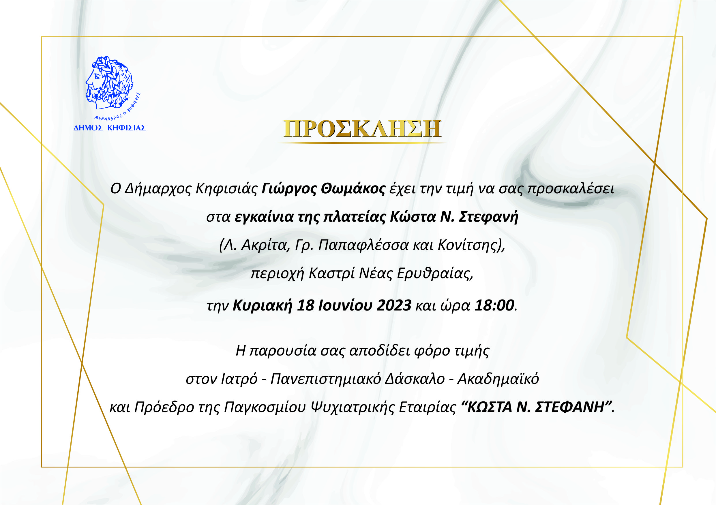 O Δήμαρχος Κηφισιάς Γιώργος Θωμάκος έχει την τιμή να σας προσκαλέσει στα εγκαίνια της πλατείας Κώστα Ν. Στεφανή (Λ. Ακρίτα, Γρ. Παπαφλέσσα και Κονίτσης) περιοχή Καστρί Νέας Ερυθραίας, την Κυριακή 18 Ιουνίου 2023 και ώρα 18.00.