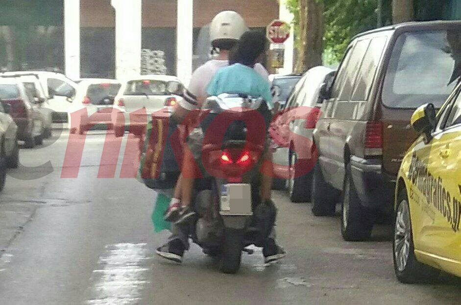 Η φωτογραφία που έστειλε αναγνώστης του enikos.gr, αν και ξεκάθαρη, είναι δύσκολο να περιγραφεί. Σε αυτήν απεικονίζεται ο ασυνείδητος οδηγός του δικύκλου να έχει πίσω του, όχι ένα, αλλά δύο ανήλικα παιδιά, χωρίς να φορούν κράνος, τα οποία δεν μπορούν να τοποθετήσουν κάπου τα πόδια τους και είναι στον αέρα.