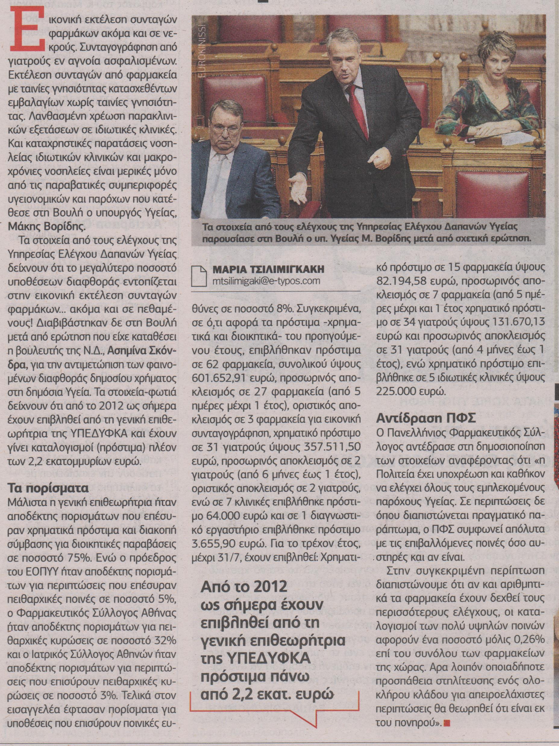 Εικονική εκτέλεση συνταγών φαρμάκων ακόμα και σε νεκρούς. Συνταγογράφηση από γιατρούς εν αγνοία ασφαλισμένων. Εκτέλεση συνταγών από φαρμακεία με ταινίες γνησιότητας κατασχεθέντων εμβαλαγίων χωρίς ταινίες γνησιότητας. Λανθασμένη χρέωση παρακλινικών εξετάσεων σε ιδιωτικές κλινικές. Και καταχρηστικές παρατάσεις νοσηλείας ιδιωτικών κλινικών και μακροχρόνιες νοσηλείες είναι μερικές μόνο από τις παραβατικές συμπεριφορές υγειονομικών και παρόχων που κατέθεσε στη Βουλή ο υπουργός Υγείας, Μάκης Βορίδης.