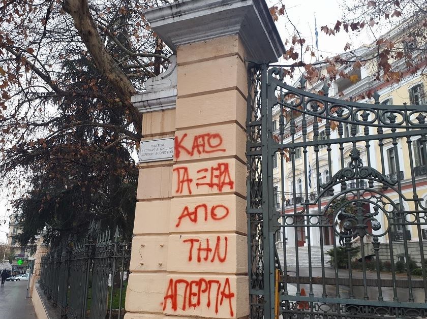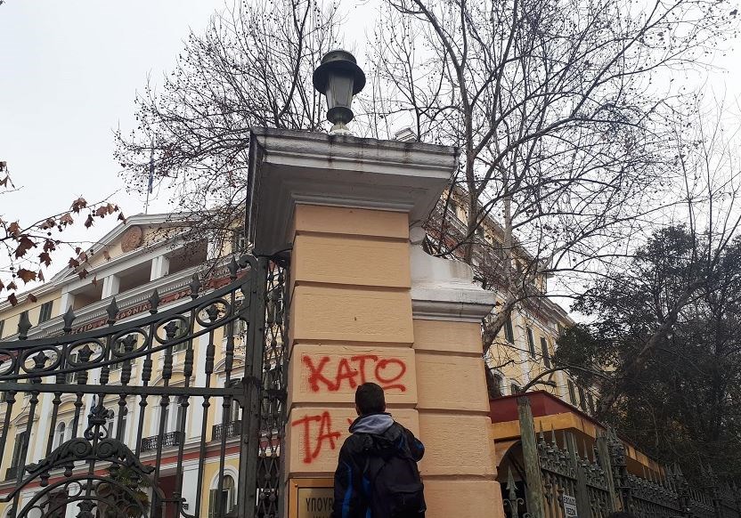Όπως αναφέρει το thestival.gr, μέλη του ΠΑΜΕ έγραψαν συνθήματα με σπρέι, στην είσοδο του κτιρίου του υπουργείου Μακεδονίας – Θράκης. “Κάτω τα χέρια από το λαϊκό βιός” και “Κάτω τα ξερά από την απεργία” ήταν τα συνθήματα που έγραψαν στους τοίχους του κτιρίου.