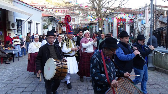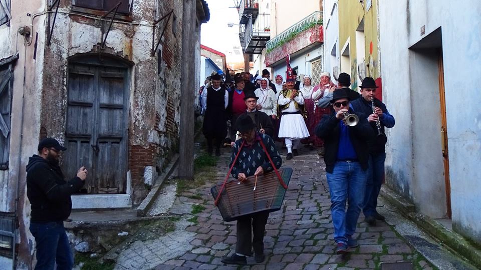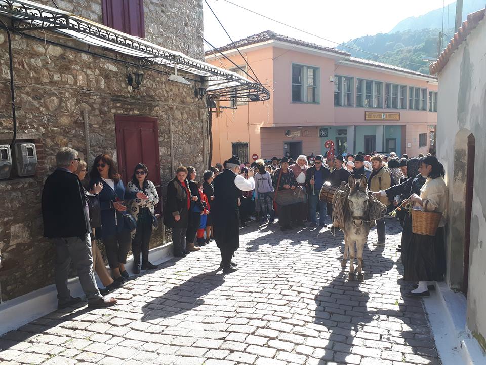 Στις 2:30 το μεσημέρι ξεκίνησε από το «Αναγνωστήριο» πολυπληθής όμιλος μασκαρεμένων με επικεφαλής τον «Μεγαλέξαντρο» και με τη συνοδεία παραδοσιακής μουσικής κομπανίας σεργιάνισε στους μαχαλάδες του χωριού τραγουδώντας παλιά παραδοσιακά μας τραγούδια και τα προαιώνια «φαλλικά τριψίματα». Κάποια στιγμή από διαφορετικές κατευθύνσεις έφθασαν και δυο καρνάβαλοι πάνω σε γαϊδουράκια αναβίωσαν το έθιμο του αντικαρνάβαλου (καρναβαλομαχίας).