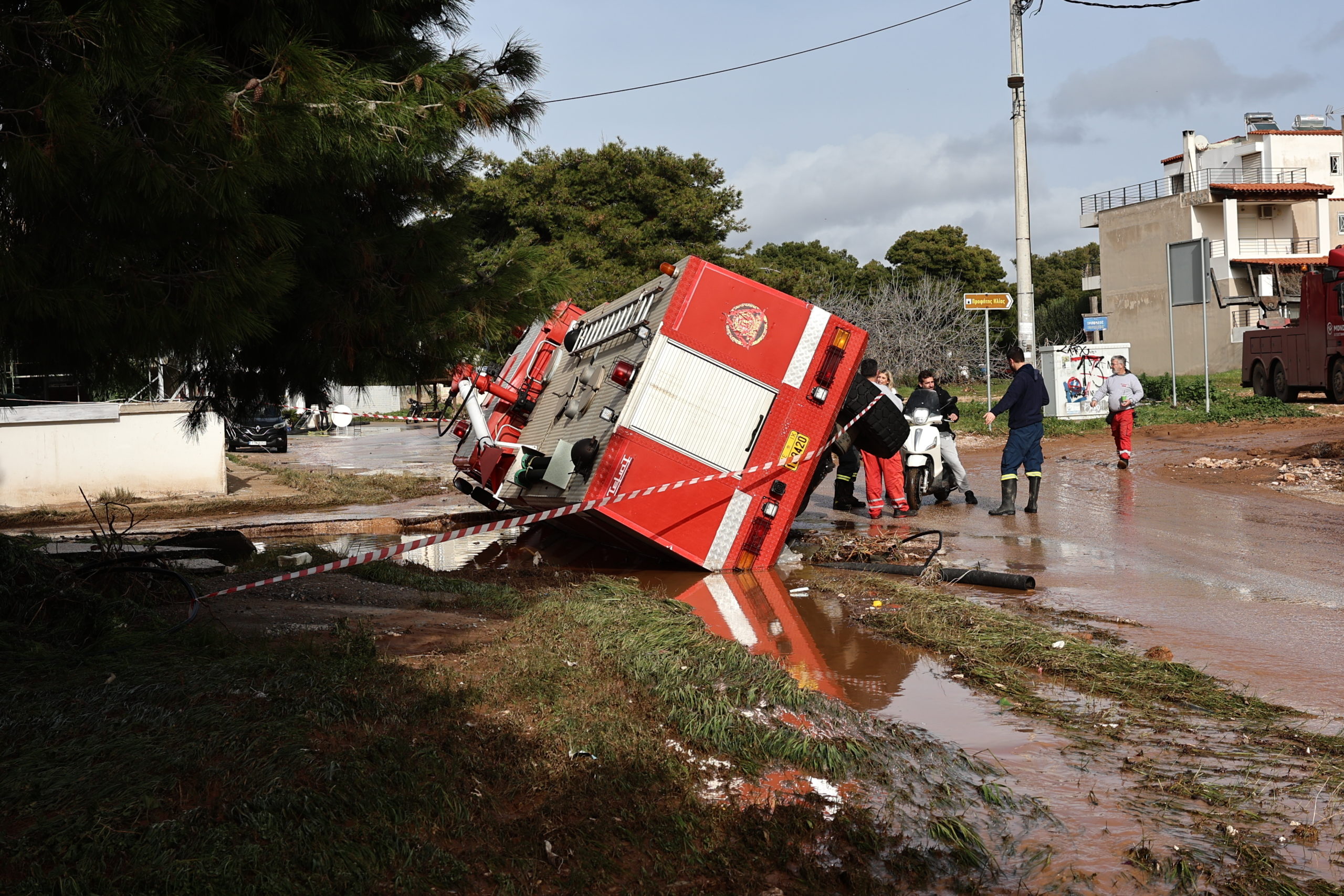 Μάλιστα, μέχρι και πυροσβεστικό όχημα που ήταν στην περιοχή, ανατράπηκε.