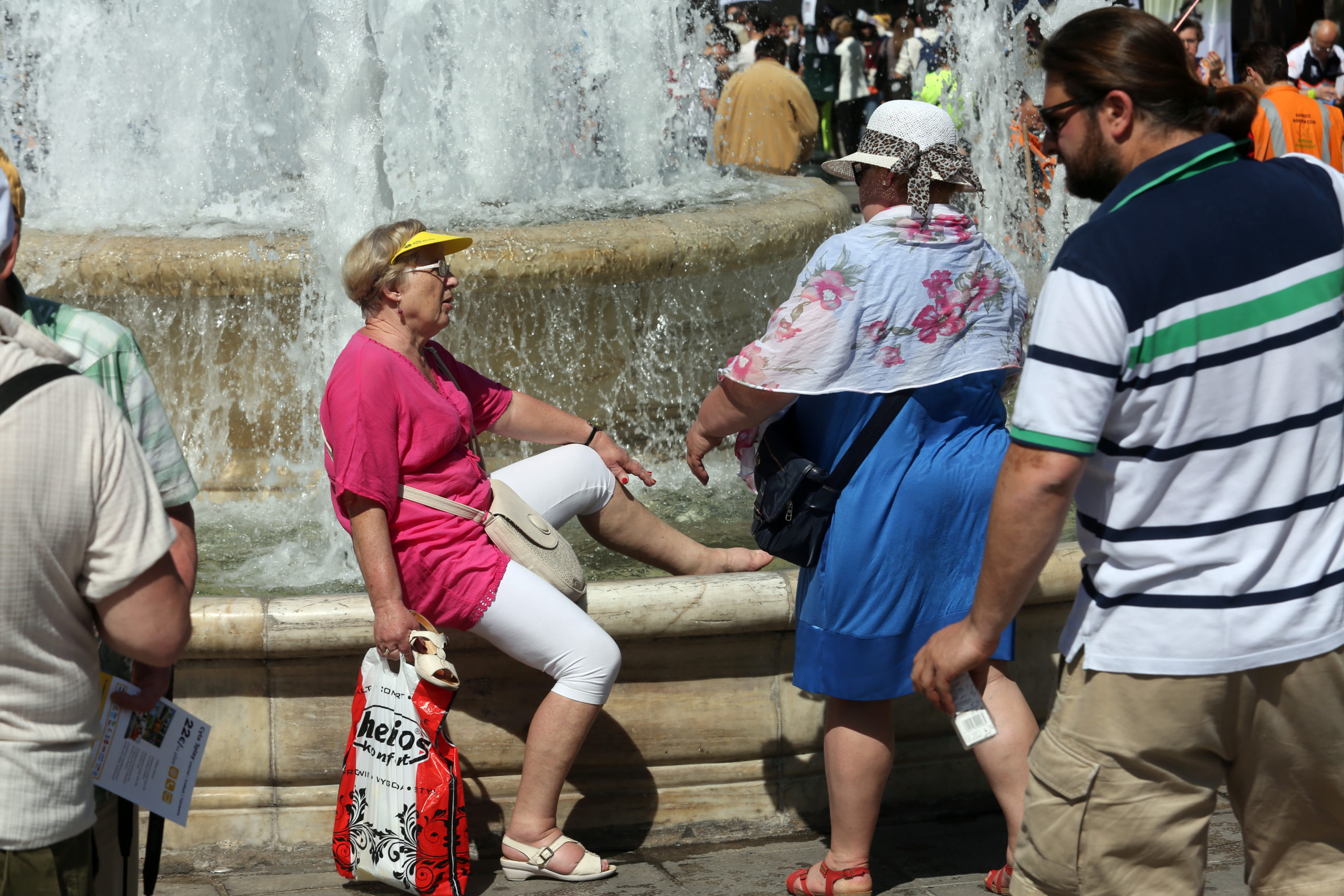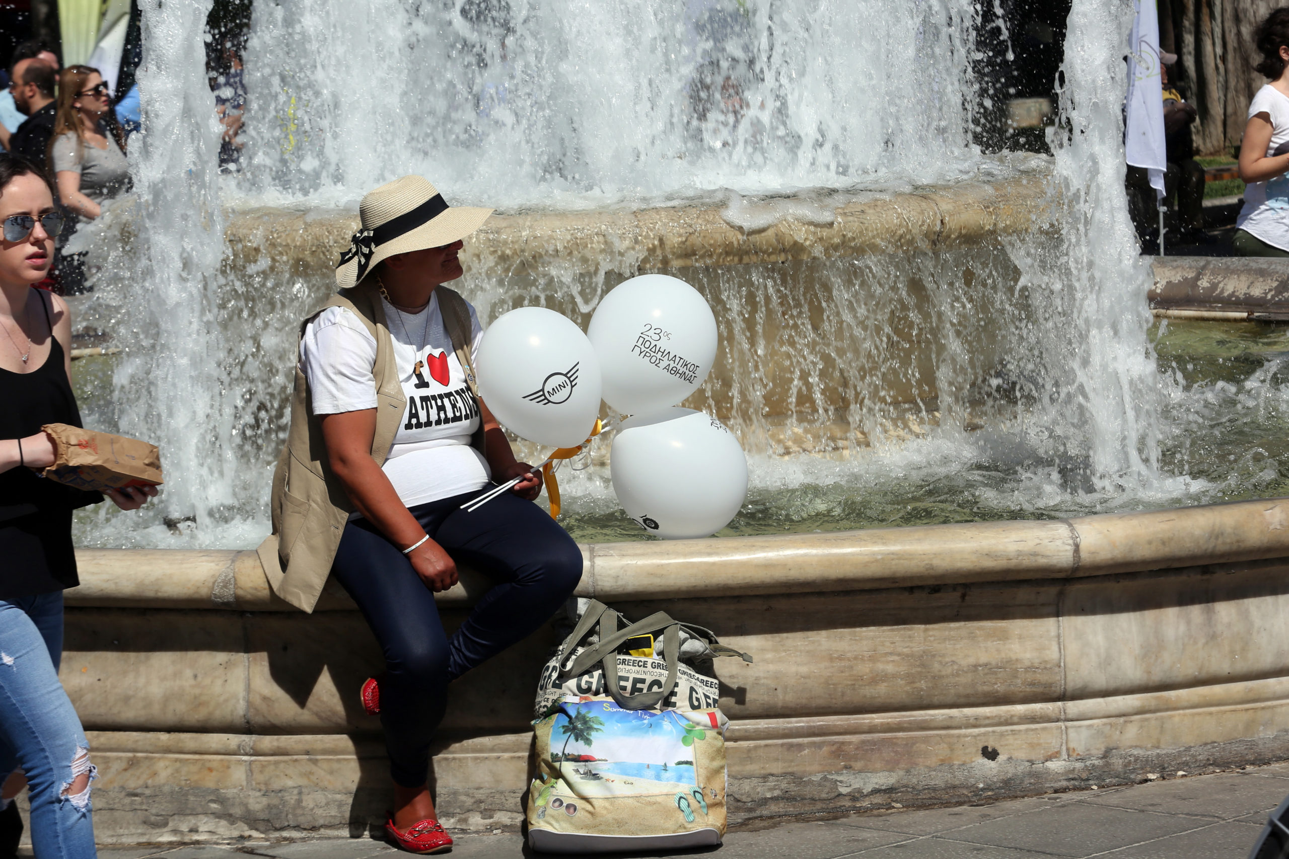 Αρκετοί ήταν οι πολίτες και οι τουρίστες της Αθήνας που στάθηκαν στο συντριβάνι της πλατείας Συντάγματος για λίγη δροσιά.
