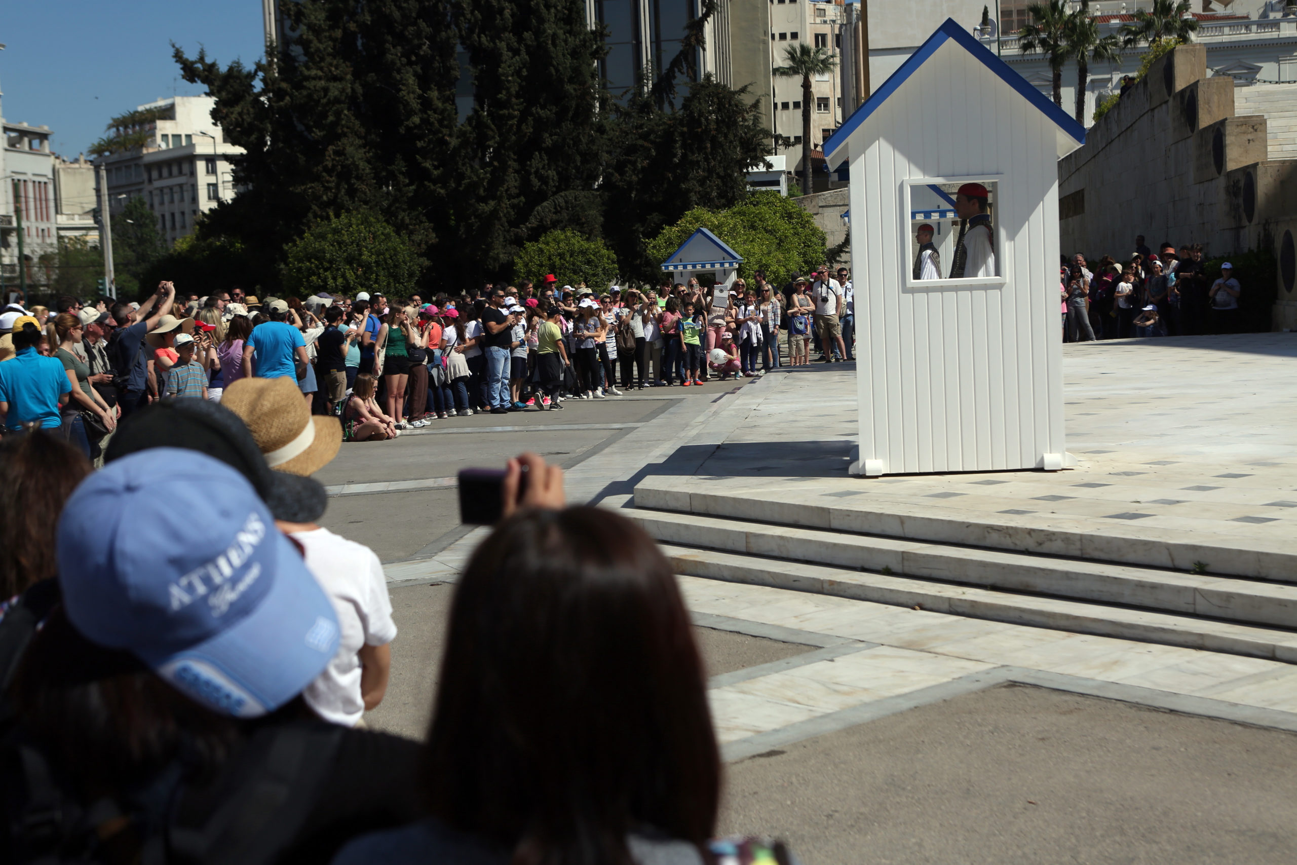 Οι τουρίστες στέκονται στον Άγνωστο Στρατιώτη μετά την αλλαγή της φρουράς, ενώ προσπαθούν να προστατευθούν από τον ήλιο με καπέλο και ομπρέλα δίπλα από το συντριβάνι.