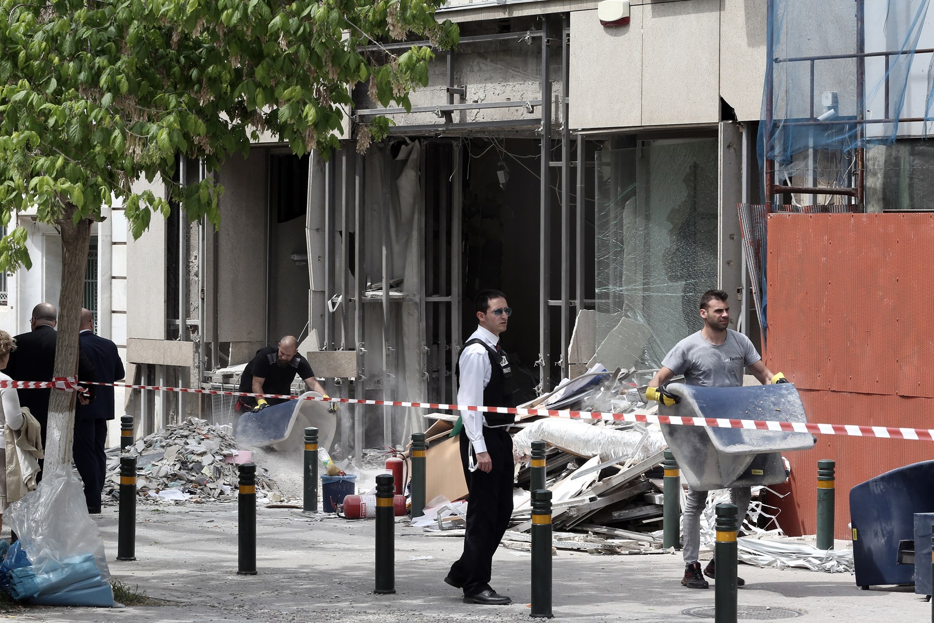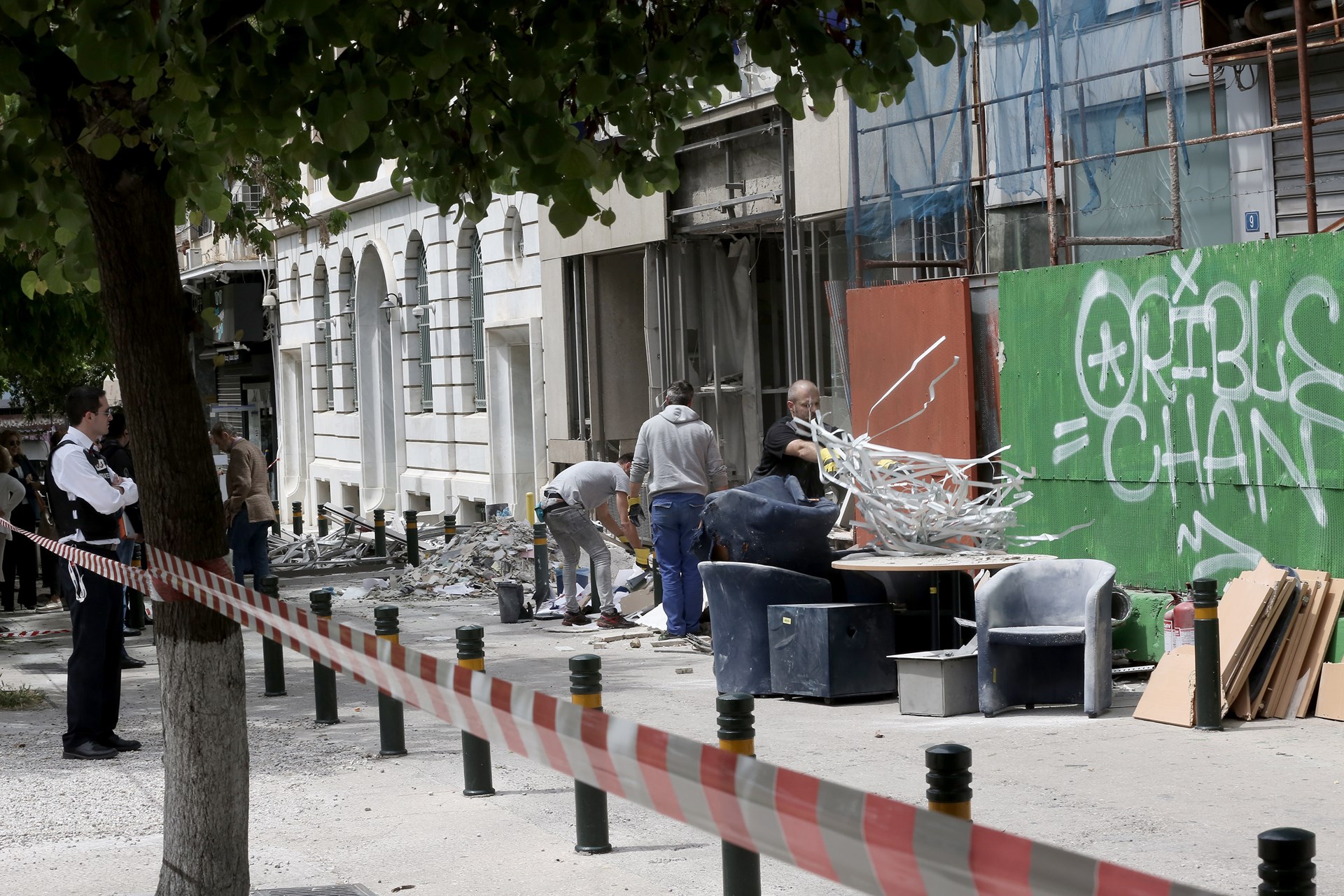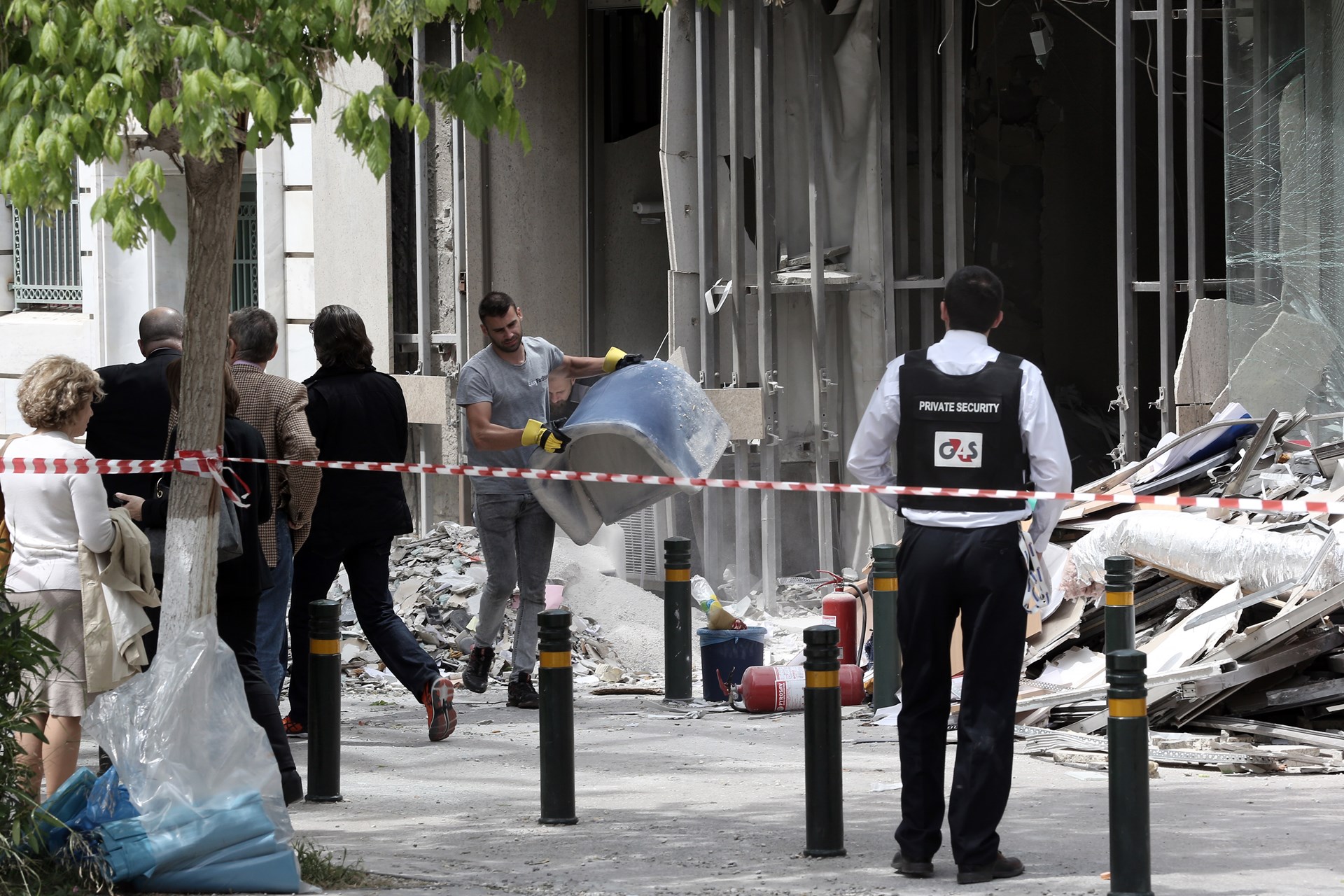 Συνεργεία αποκατάστασης μαζεύουν τα συντρίμμια έξω από τα κτίρια της τράπεζας στην οδό Σανταρόζα, όπου έγινε χθες η έκρηξη βόμβας.Υπενθυμίζουμε ότι η ισχυρή έκρηξη της βόμβας, χθες το βράδυ, στο κτίριο που στεγάζονται τα κεντρικά γραφεία ανθρώπινου δυναμικού της τράπεζας, είχε ως αποτέλεσμα να προκληθούν σοβαρές ζημιές, οι οποίες επεκτάθηκαν και στα γύρω κτίρια.Δείτε τις φωτογραφίες από τις σημερινές εργασίες των συνεργείων αποκατάστασης.