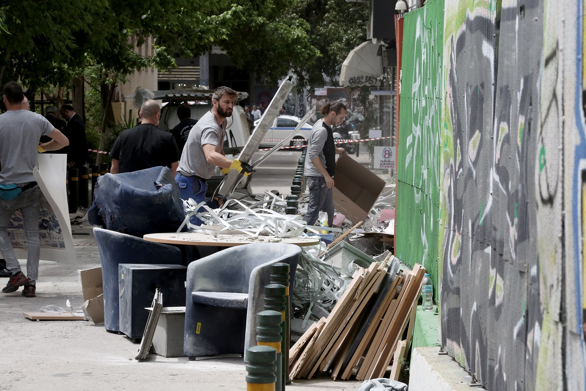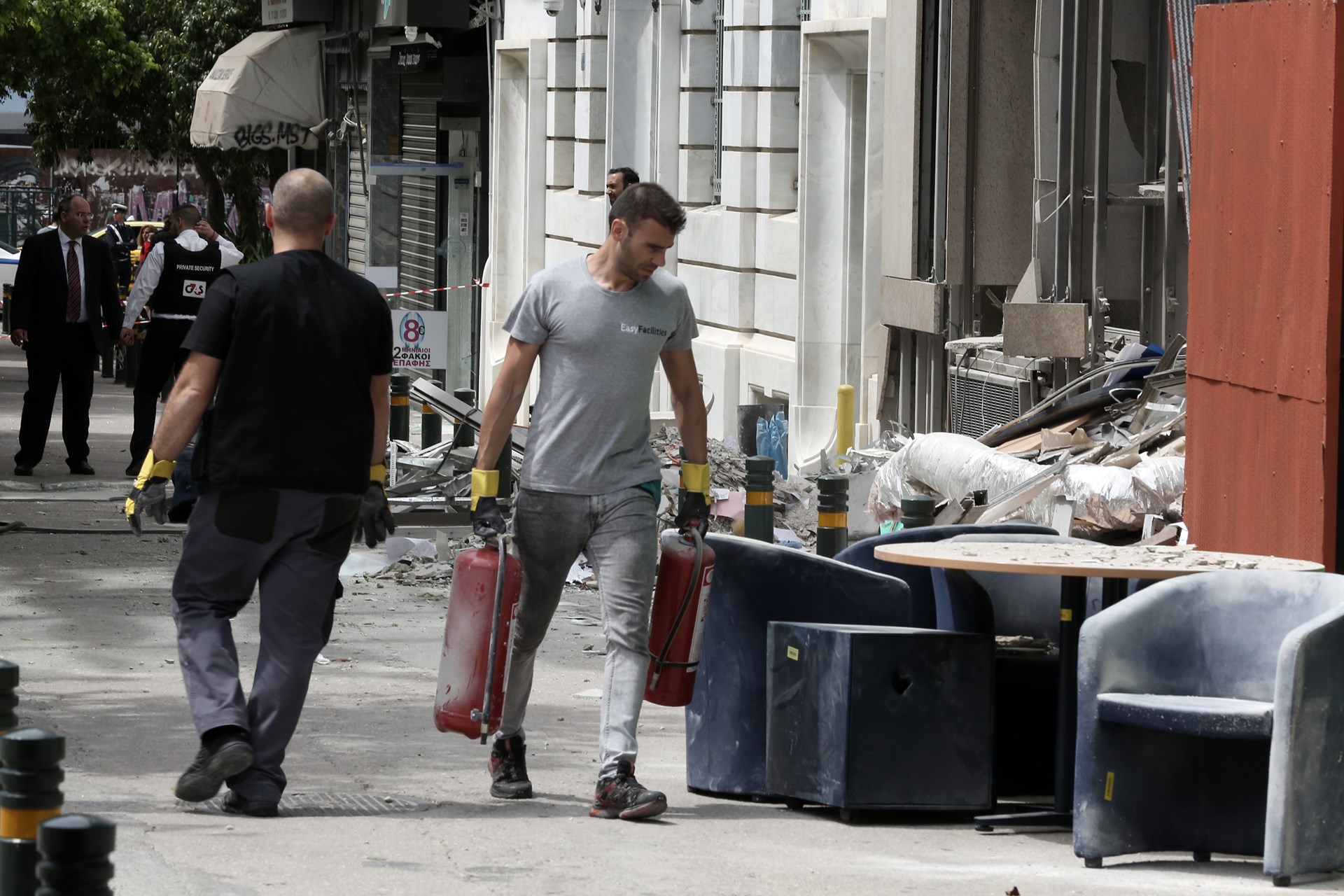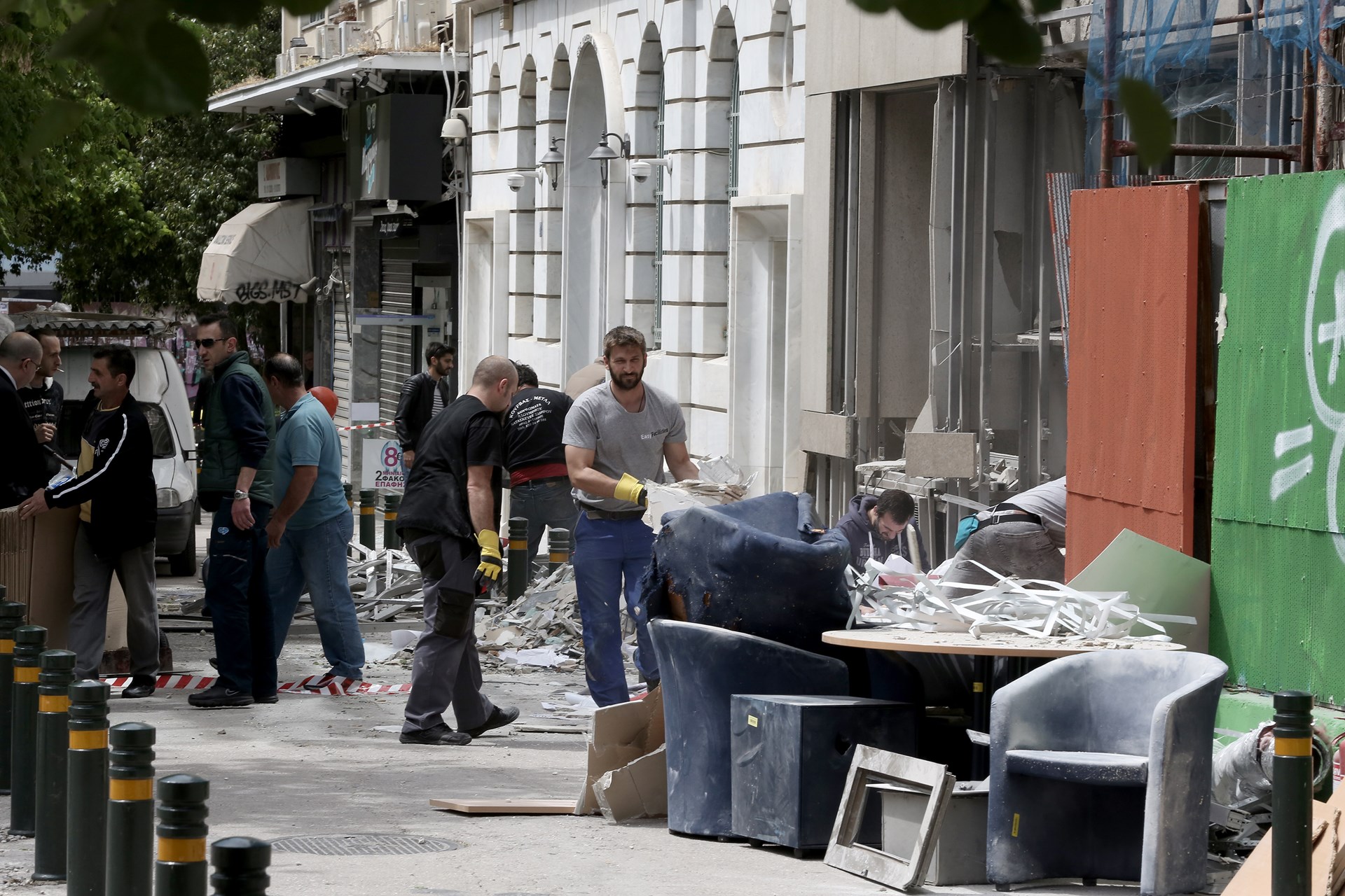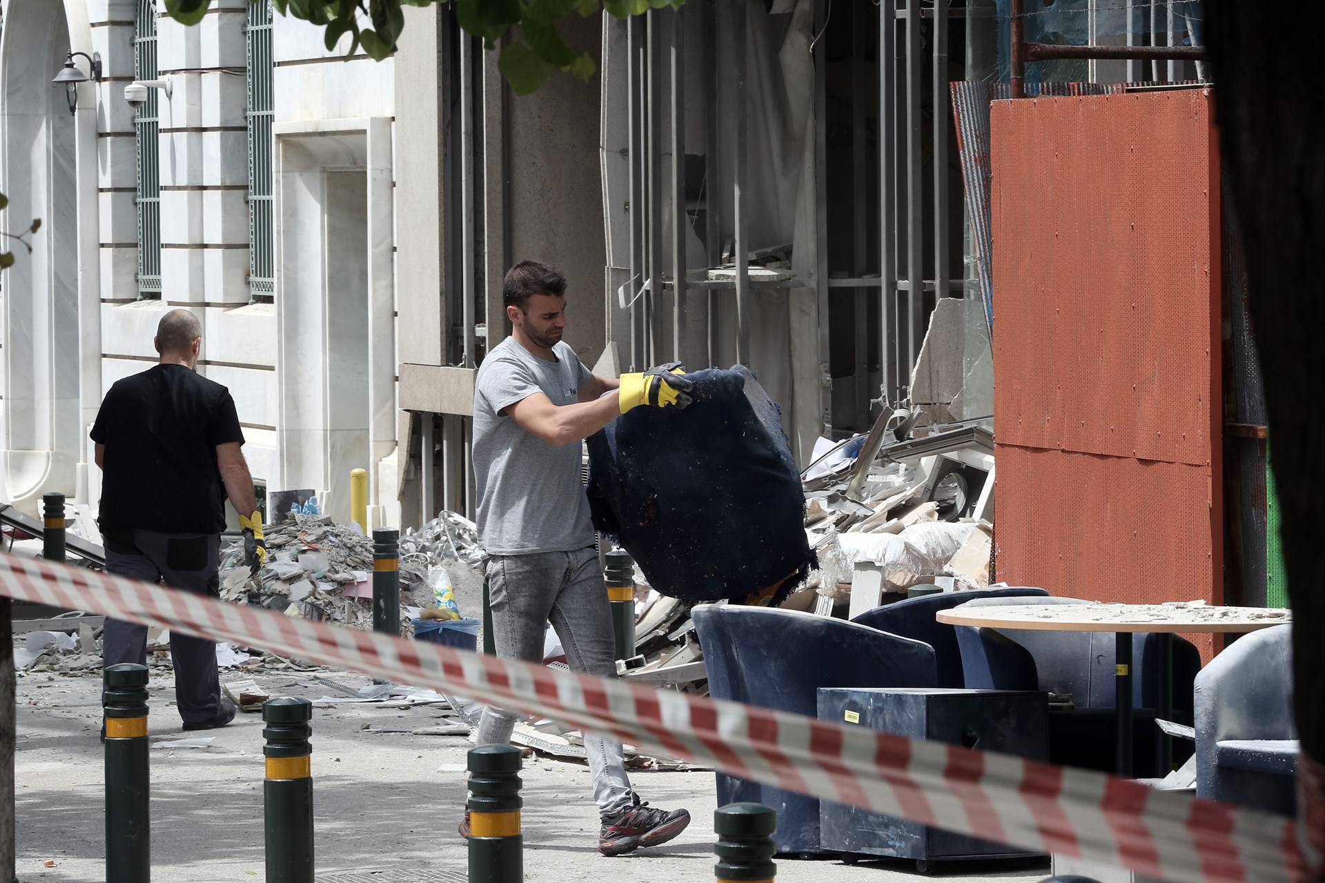 Συνεργεία αποκατάστασης μαζεύουν τα συντρίμμια έξω από τα κτίρια της τράπεζας στην οδό Σανταρόζα, όπου έγινε χθες η έκρηξη βόμβας.Υπενθυμίζουμε ότι η ισχυρή έκρηξη της βόμβας, χθες το βράδυ, στο κτίριο που στεγάζονται τα κεντρικά γραφεία ανθρώπινου δυναμικού της τράπεζας, είχε ως αποτέλεσμα να προκληθούν σοβαρές ζημιές, οι οποίες επεκτάθηκαν και στα γύρω κτίρια.Δείτε τις φωτογραφίες από τις σημερινές εργασίες των συνεργείων αποκατάστασης.