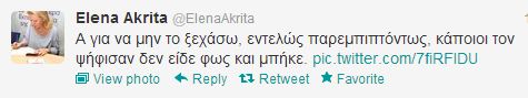 Όλα ξεκίνησαν, στις 13 Οκτωβρίου, όταν ή Έλενα Ακρίτα, μετά τα επεισόδια στο θέατρο “Χυτήριο” και την εκεί παρουσία του βουλευτή της Χρυσής Αυγής, Ηλία Παναγιώταρου, έγραψε στο twitter της: