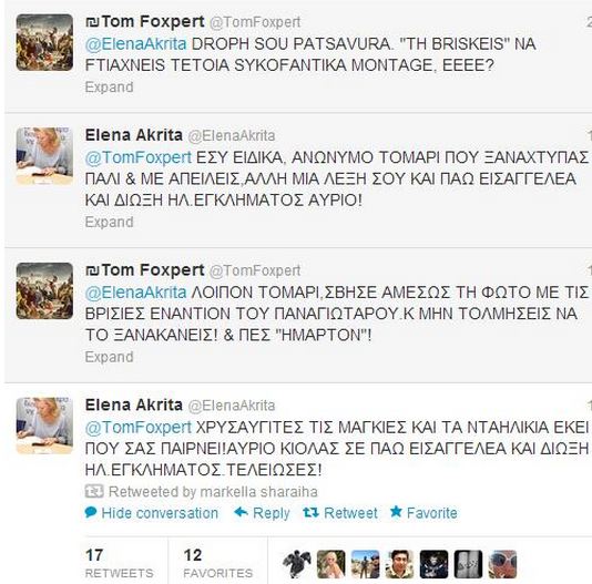 Αυτό οδήγησε τον χρήστη, με το nickname Tom Foxpert, που φέρεται να είναι οπαδός της Χρυσής Αυγής να αρχίσει να εκτοξεύει ύβρεις προς την δημοσιογράφο.