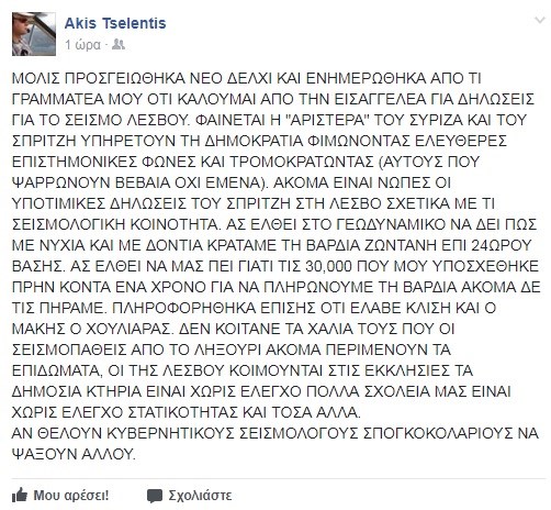 Δείτε την ανάρτηση του Άκη Τσελέντη στο facebook: