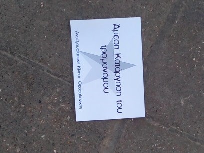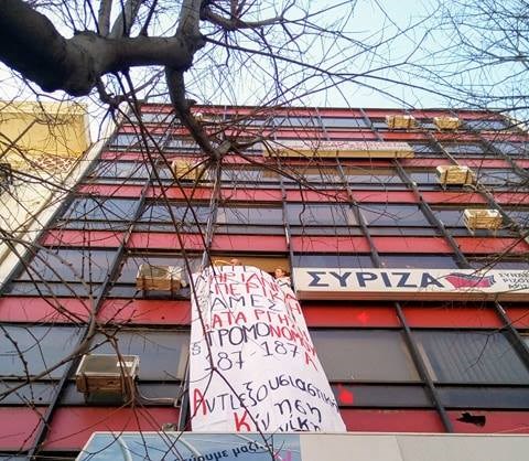 Παρέμβαση στα κεντρικά γραφεία του ΣΥΡΙΖΑ στη Θεσσαλονίκη (Εγνατίας 76) έκαναν μέλη της Αντιεξουσιαστικής Κίνησης, στο πλαίσιο της πανελλαδικής ημέρας δράσης για την Ηριάννα και τον Περικλή.