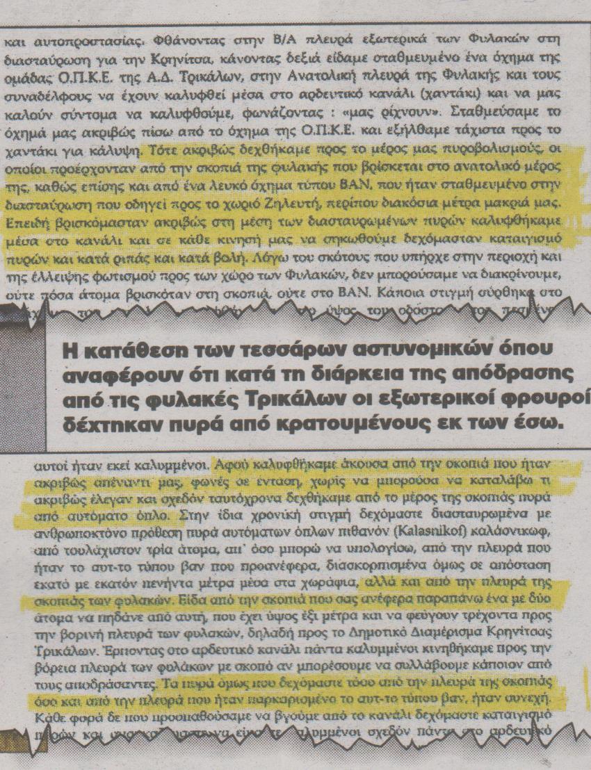 Στον αέρα τινάζουν η μαρτυρία του προέδρου της ομοσπονδίας εξωτερικών φρουρών Γιάννη Αναγνώστου και οι καταθέσεις τεσσάρων αστυνομικών της Ομάδας Πρόληψης και Καταστολής Εγκλήματος την επίσημη εκδοχή της αστυνομίας και του υπουργείου Δικαιοσύνης ότι δεν έπεσαν πυροβολισμοί εκ των έσω κατά την αιματηρή απόδραση των έντεκα από τις φυλακές Τρικάλων.